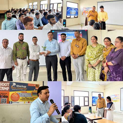 Government Polytechnic College today organised a Boot camp under the Start-up India Challenge in collaboration with the Jammu and Kashmir Entrepreneurship Development Institute (JKEDI). The event began with an address by Er. Arun Bangotra, Principal Government Polytechnic Reasi, who motivated the students by sharing inspiring examples of successful start-ups such as Zomato, Paytm, OYO etc and he encouraged students to think creatively and pursue entrepreneurship with confidence. Mr. Sorab Mengi (Assistant Manager), JKEDI and Shri Abilash Kumar Braroo, District Nodal Officer, JKEDI Reasi shared insights into the various programs and policies undertaken by JKEDI to strengthen the startup ecosystem in Jammu and Kashmir and provided valuable insights and created awareness about Start-up India opportunities.